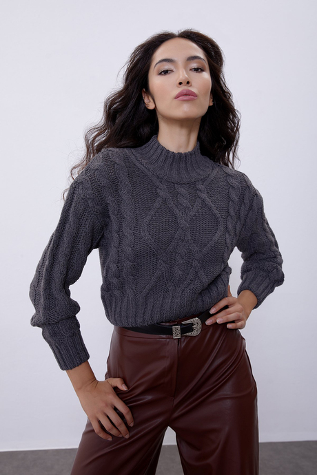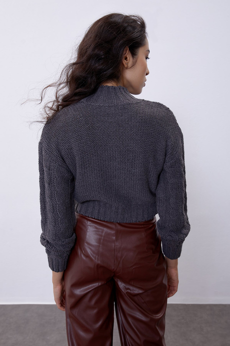 Sherin Kadın Antrasit Örgü Desenli Kısa Kazak SWK4306ANT