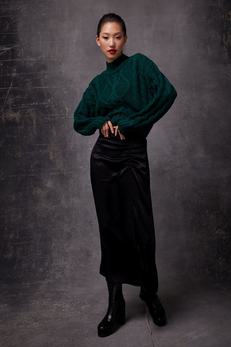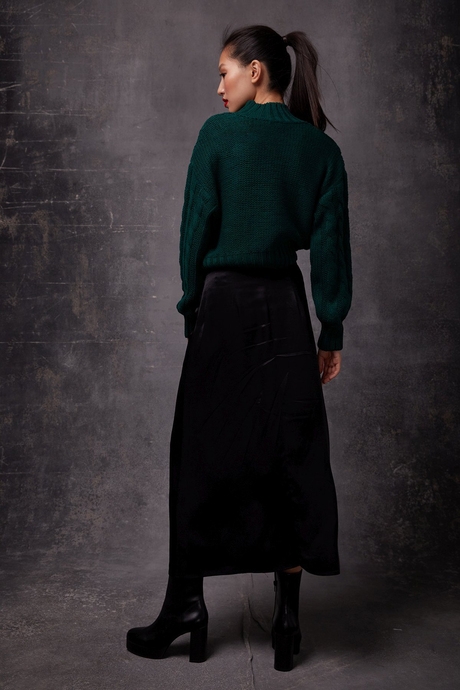 Fabric Material %100 ACRYLIC Dark Green knitted patterned short sweater, long sleeve, turtleneck, ribbed at collar and hem, relaxed fit .Model wears size S. Wash at maximum 30 °C, Wash inside out gentle washing.Do not bleach.Do not tumble dry.Dry flat.Iron on reverse in low temperature