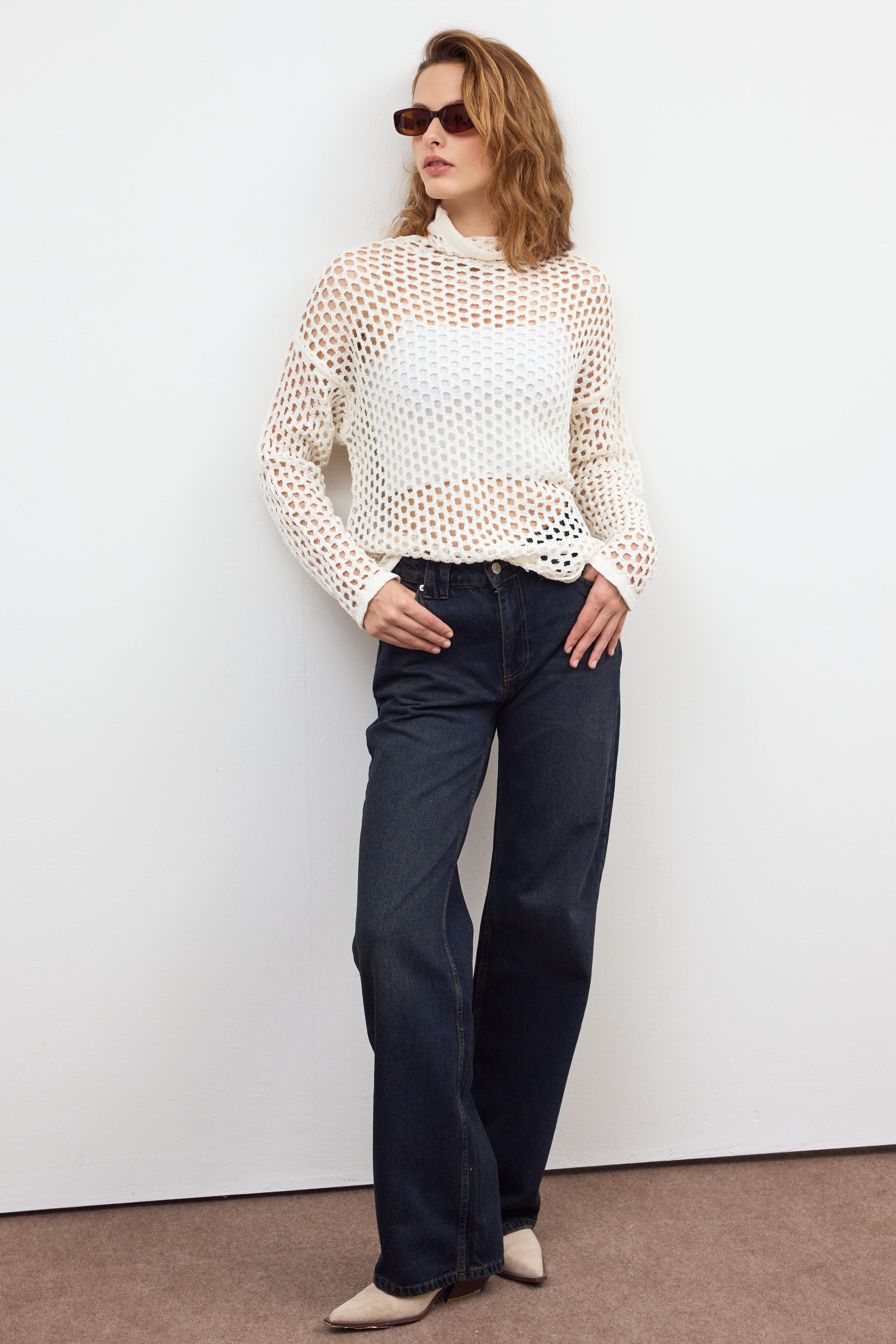 Yarn Content: 51% Cotton 49% Polyester. Product Features: Wide fit, long-sleeve, funnel neck, openwork details knitwear sweater. Size Information: The product on the model is size S-M. Model Height: 1.75m, Bust: 87cm, Waist: 63cm, Hips: 90cm. Model Size: 36. There may be a deviation between sizes. S-M Size Measurements: Bust: 54 cm Sleeve Length: 49 cm Length: 65 cm. M-L Size Measurements: Bust: 56 cm Sleeve Length: 48 cm Length: 67 cm. SW23K4891EK. Washing Instructions: Wash gently inside out at a maximum temperature of 30°C. Do not bleach. Do not tumble dry. Dry flat. Iron at low temperature inside out.