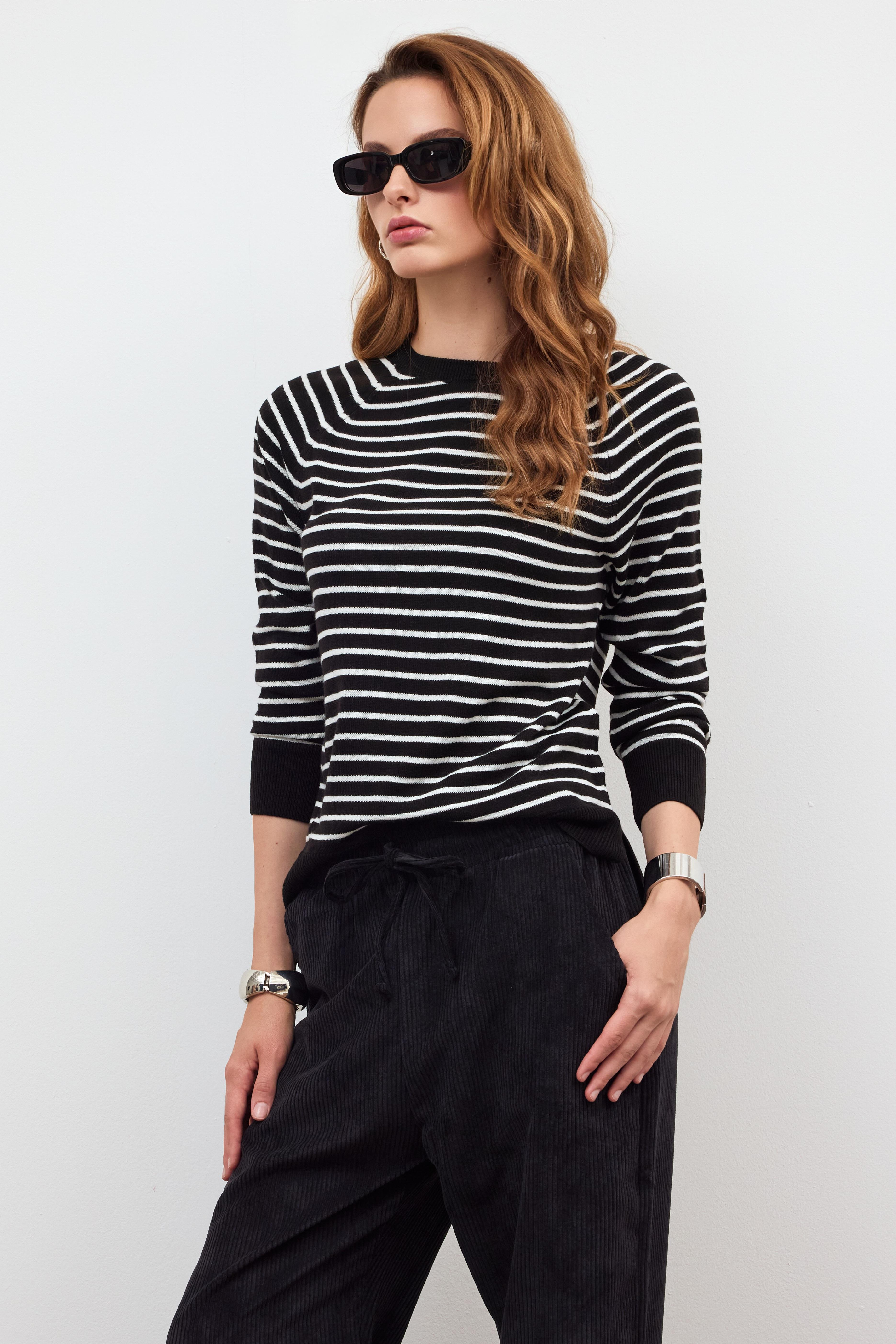 Siyah Bisiklet Yaka Çizgili Kazak (SW23K4948Sİ)