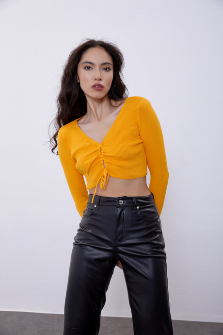Kumaş Materyali %100 Pamuk Sarı derin v yaka dekolteli triko, uzun kollu, fitilli ip detaylı .Manken üzerindeki ürün S bedendir Maksimum 30 °c Sıcaklıkta Tersten Hassas Yıkayınız.Ağartıcı Kullanmayınız.Kurutucuda Kurutulmaz.Sererek Kurutunuz.Düşük Sıcaklıkta Tersten Ütüleyiniz.
